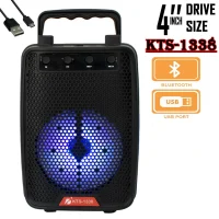 اسپیکر بی سیم قابل حمل مدل KTS-1338ساخته شده از پلاستیک با کیفیت، دارای دسته ی تاشو جهت حمل و استند به منظور نگهداری گوشی موبایل نحوه ی اتصال به صورت بی سیم توسط بلوتوث با برد تقریبی ۱۰ متری، سایز اسپیکر 4 اینچ با توان خروجی کلی ۵ وات با پشتیبانی از فلش مموری و رم میکرو SD با ظرفیت حداکثر تا 64گیگابایت، دارای ورودی میکروفون نسبت سیگنال به نویز ۸۵ دسی بل، پاسخ فرکانسی ۱۰۰ هرتز الی ۲۰ کیلوهرتز جهت پوشش صداهای زیر و بم دارای باتری داخلی از نوع لیتیومی با ظرفیت ۵۰۰ میلی آمپر ساعت قابل شارژ توسط توسط پورت MicroUSB و کابل همراه میزان شارژدهی حدود 2ساعت با حجم صدای ۷۵ درصد، زمان مورد نیاز جهت شارژ مجدد حدود2 ساعت دارای کلیدهای فیزیکی جهت روشن و خاموش کردن دستگاه، مدیریت موسیقی، حجم صدا و …با پشتیبانی از رادیو FM در بازه ی فرکانسی ۸۷٫۵ هرتز الی ۱۰۸ مگاهرتز برای علاقه مندان مجهز به نورپردازی LED، با پشتیبانی از قابلیت TWS به منظور اتصال همزمان دو دستگاه اسپیکر به یک منبع بلوتوثی و پخش موسیقی موجود در فروشگاه مبین